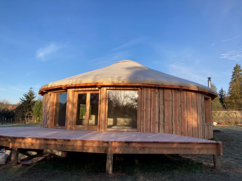 Yourte de 11 m de diamètre, normes ERP et PMR, avec sas d’entrée. Bardage bois, plancher en charmes et grandes baies vitrées.