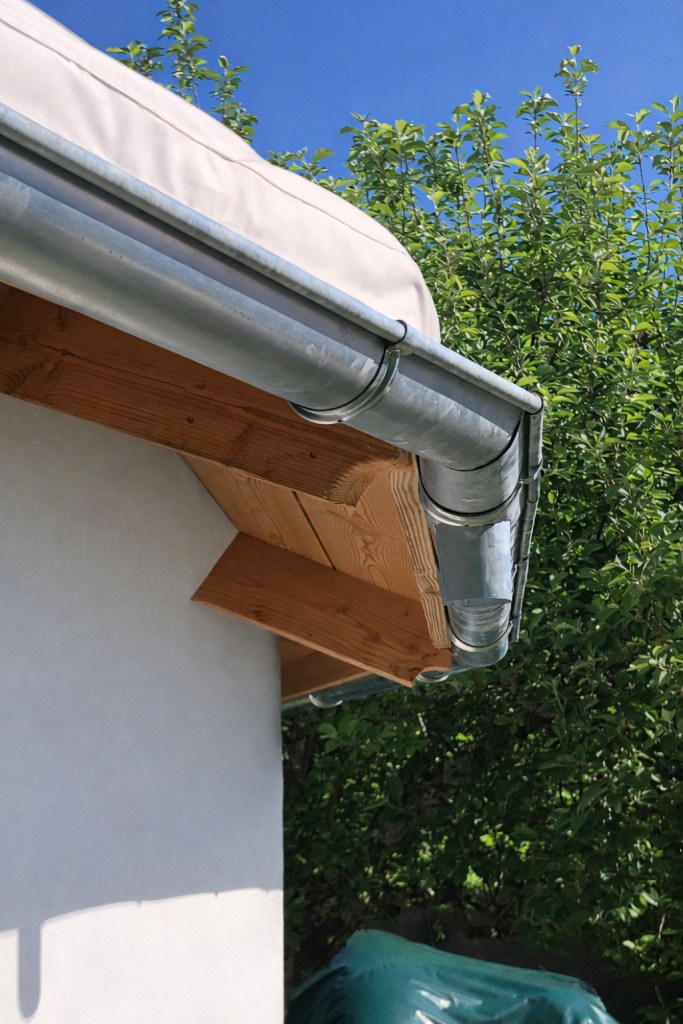 - Des débords de toits intégraux pour protéger les menuiseries, permettre une récupération d’eau de pluie et faciliter l’installation d’un revêtement en dur