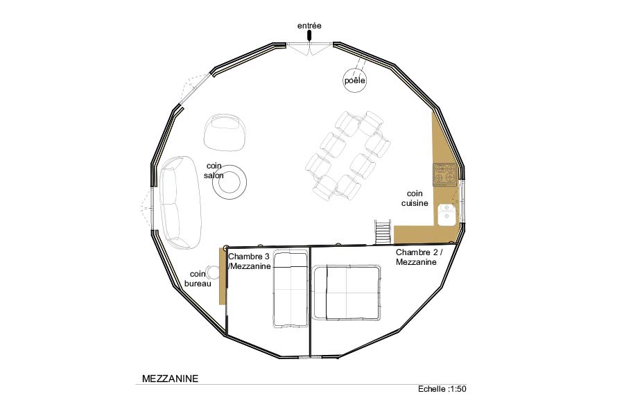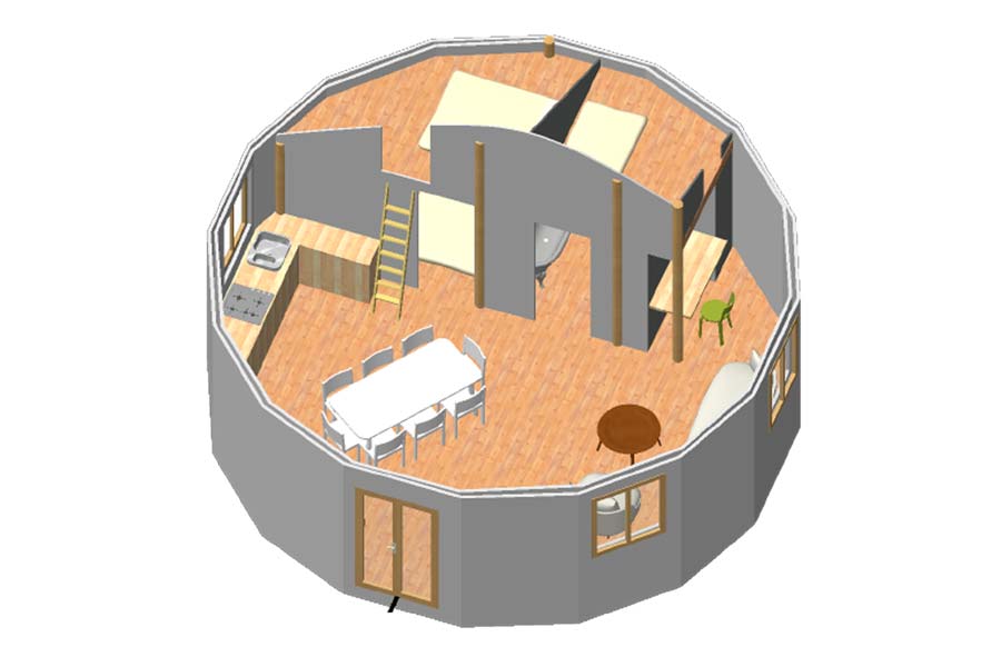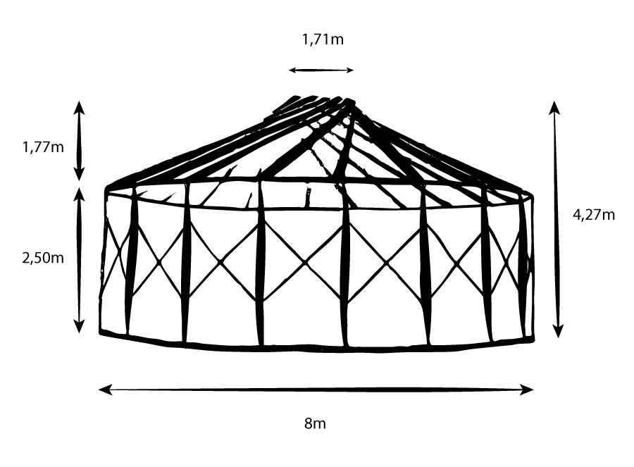 Les yourtes de 8 mètres sont idéales pour loger une personne seule ou un couple avec des enfants de manière spacieuse. Il est possible de rajouter une mezzanine afin d’optimiser l’espace et de créer des pièces fermées : salle de bain, chambres…