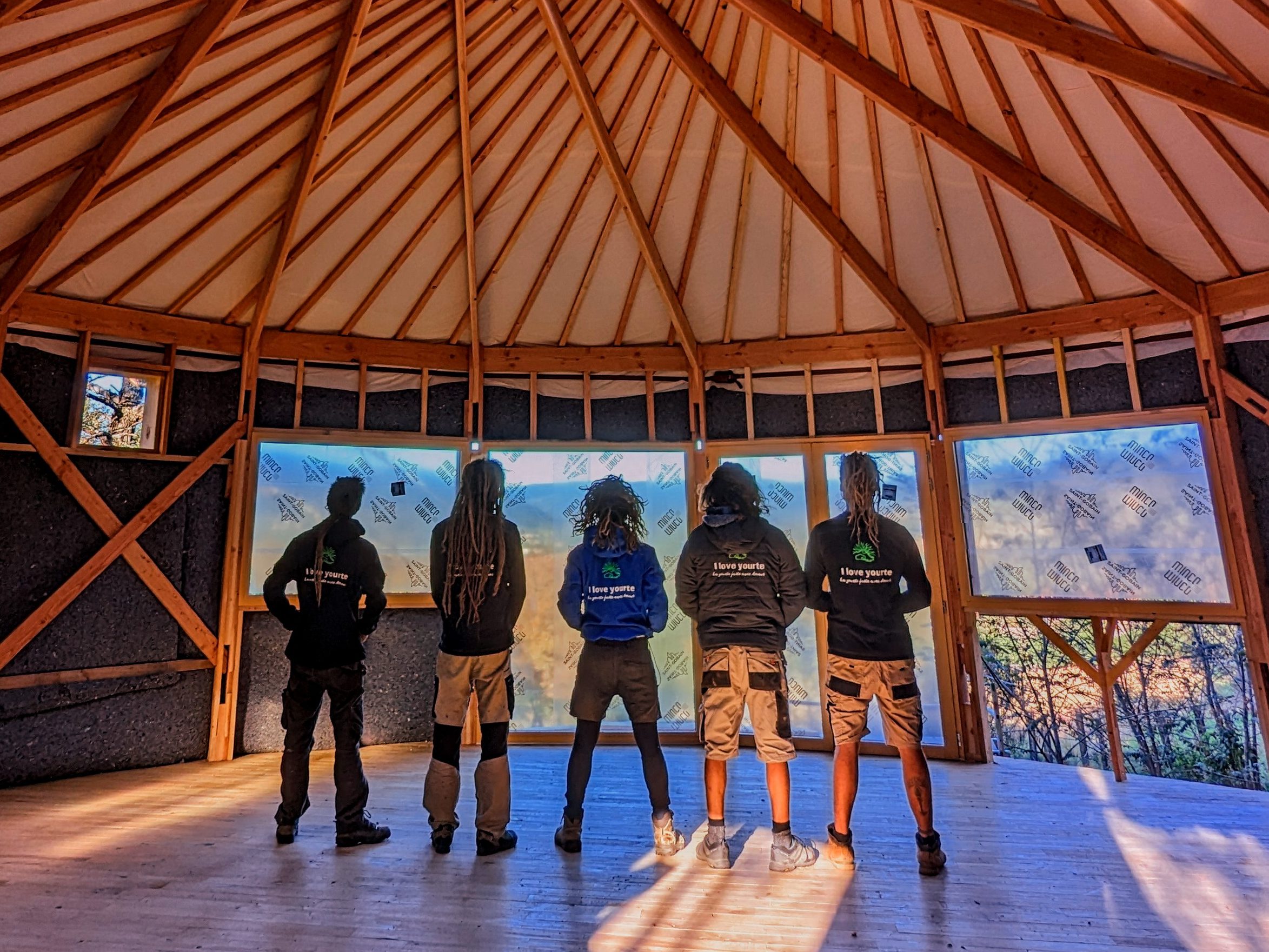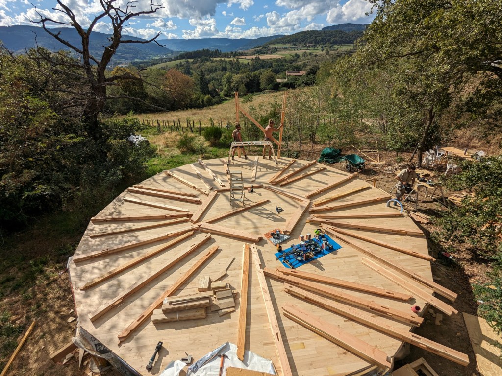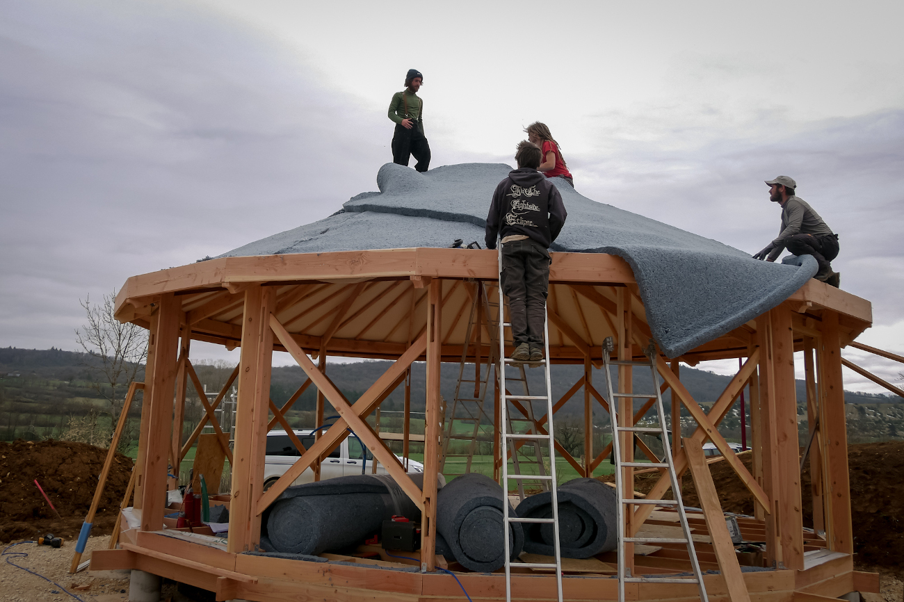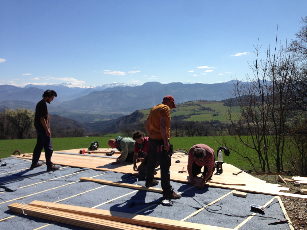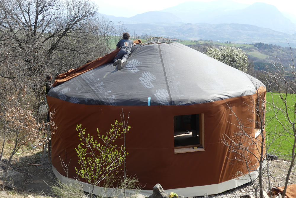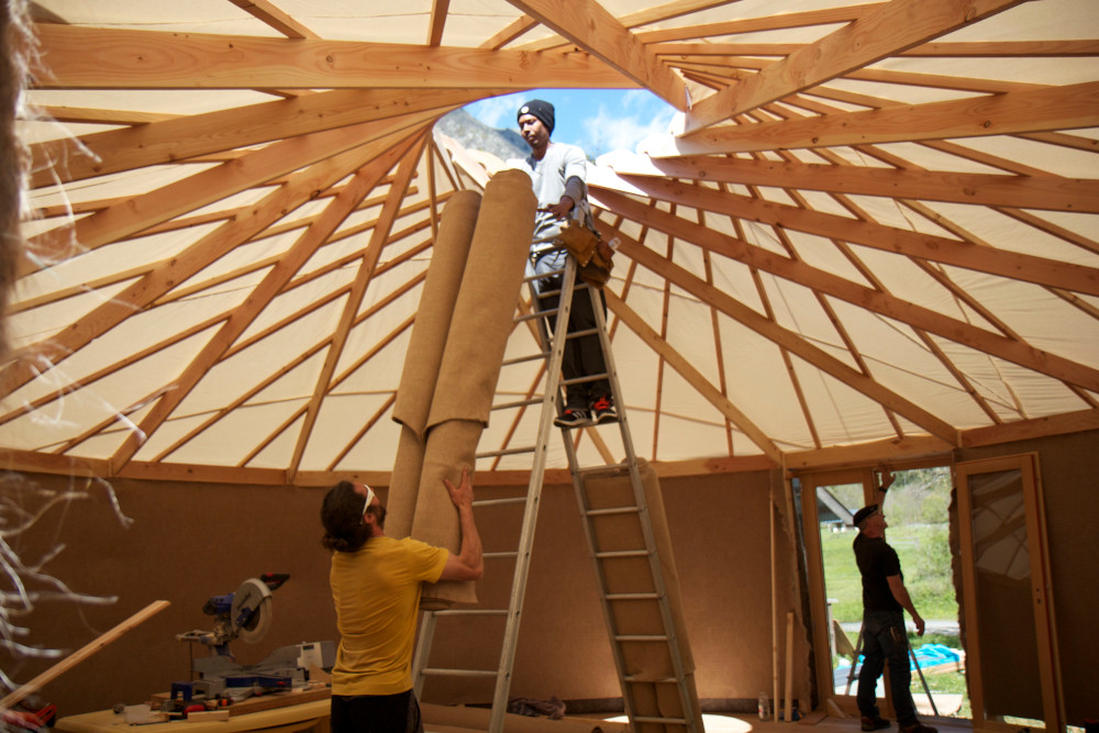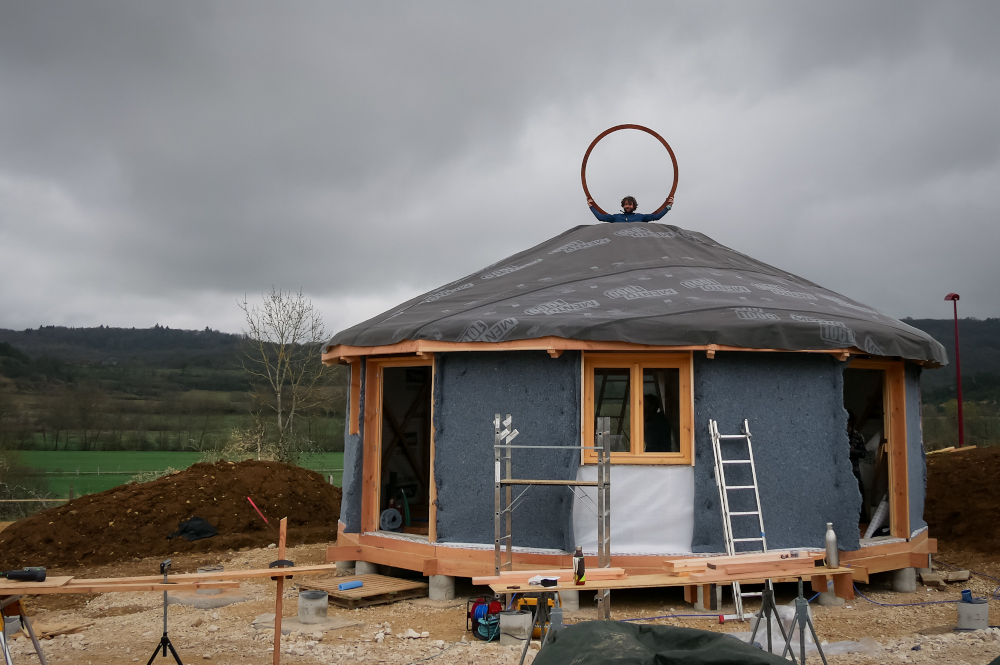 Je viens avec 1 ou 2 personnes de mon équipe et vous fournissez le reste de la team (entre 2 et 6 personnes chaque jour). Le nombre exact de bénévoles nécessaire sera détaillé après validation du devis en fonction de l’ampleur du chantier et du contexte. Cette formule vous permet d’apprendre à nos côtés et de bien connaître votre yourte, ce qui sera un grand « plus » pour l’entretenir ou la faire évoluer. Ceci dit, elle est délicate et demande beaucoup d’adaptabilité de part et d’autre. C’est un engagement de votre part, vous vous devez de jouer le jeu et de recruter votre équipe afin que cela soit vraiment donnant donnant. Un bénévole motivé et bricoleur en vaut deux les mains dans les poches !:) On vous demande également si possible de nous loger et nourrir le temps du chantier (au moins le midi), ce qui permet d’éviter les frais de déplacement. Ayez bien à l’esprit que les journées sont intenses et que nous avançons à une sacrée cadense, profitant notamment des beaux créneaux météo pour mettre le paquet. Certaines étapes ne permettent pas de passer la nuit sans être protégées de l’humidité.