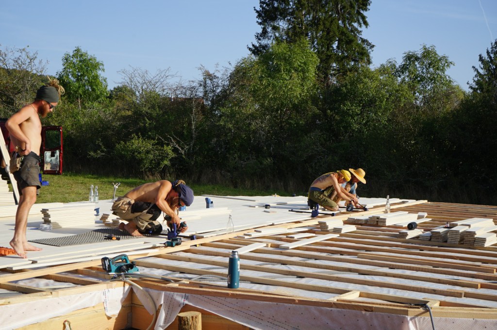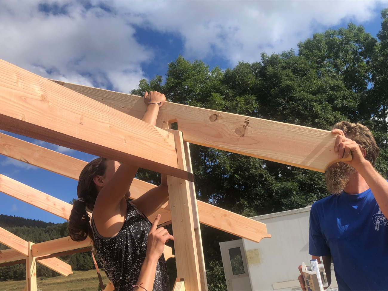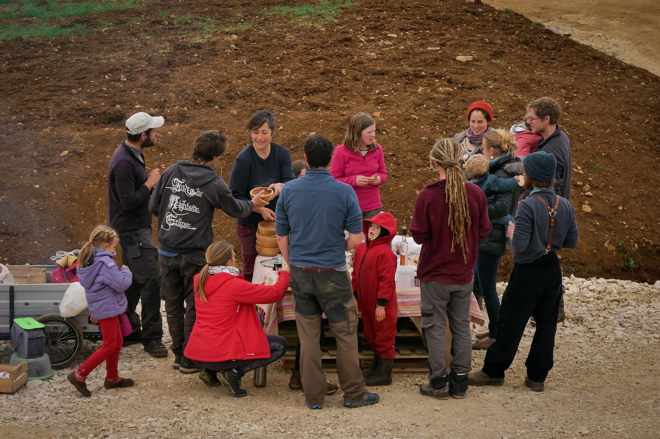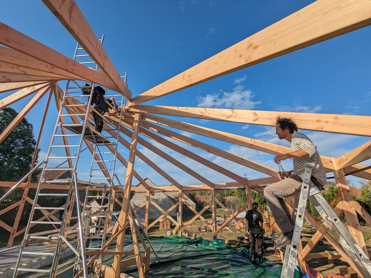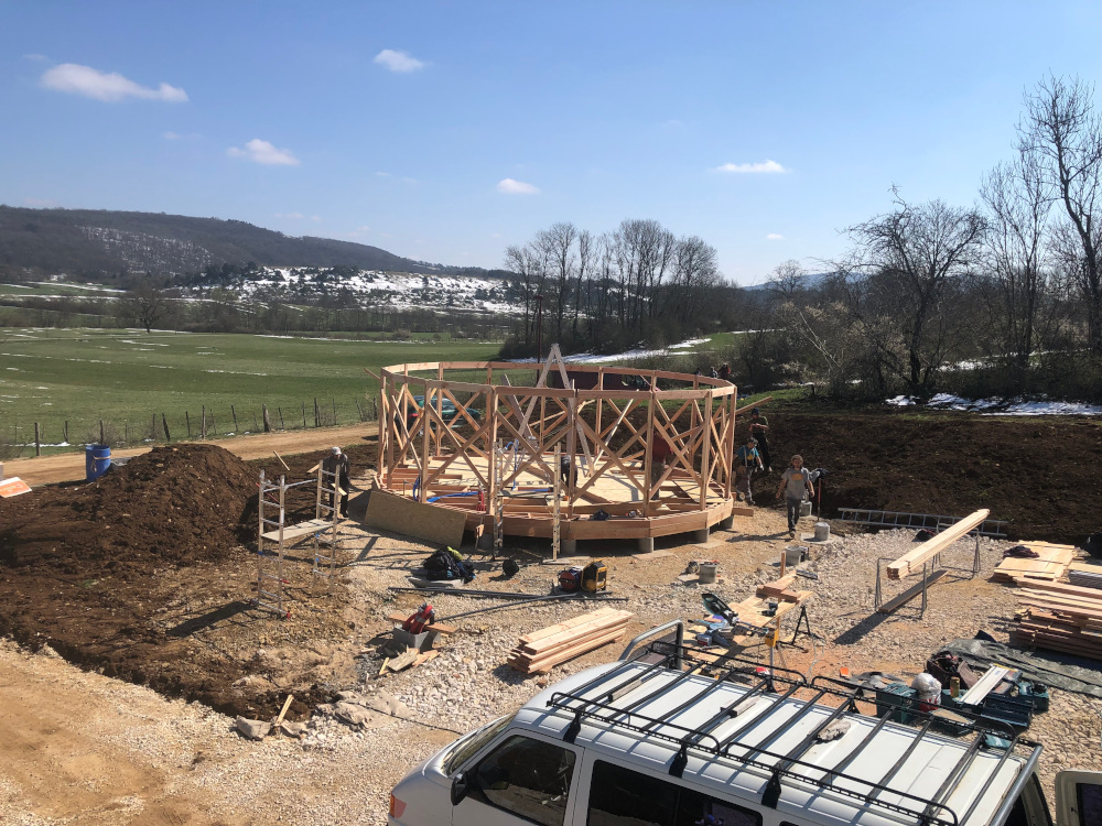 Je viens avec 1 ou 2 personnes de mon équipe et vous fournissez le reste de la team (entre 2 et 6 personnes chaque jour). Le nombre exact de bénévoles nécessaire sera détaillé après validation du devis en fonction de l’ampleur du chantier et du contexte. Cette formule vous permet d’apprendre à nos côtés et de bien connaître votre yourte, ce qui sera un grand « plus » pour l’entretenir ou la faire évoluer. Ceci dit, elle est délicate et demande beaucoup d’adaptabilité de part et d’autre. C’est un engagement de votre part, vous vous devez de jouer le jeu et de recruter votre équipe afin que cela soit vraiment donnant donnant. Un bénévole motivé et bricoleur en vaut deux les mains dans les poches !:) On vous demande également si possible de nous loger et nourrir le temps du chantier (au moins le midi), ce qui permet d’éviter les frais de déplacement. Ayez bien à l’esprit que les journées sont intenses et que nous avançons à une sacrée cadense, profitant notamment des beaux créneaux météo pour mettre le paquet. Certaines étapes ne permettent pas de passer la nuit sans être protégées de l’humidité.