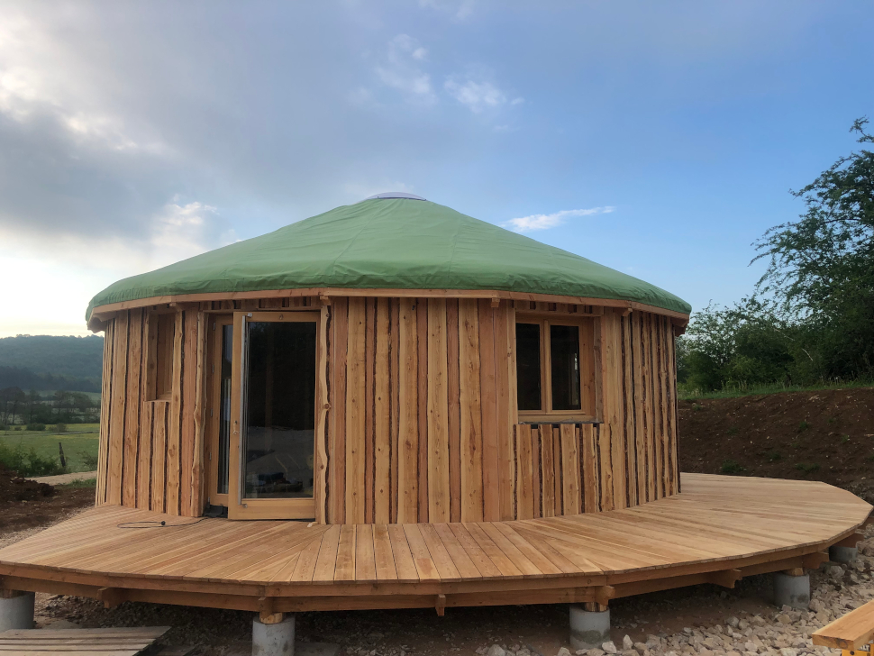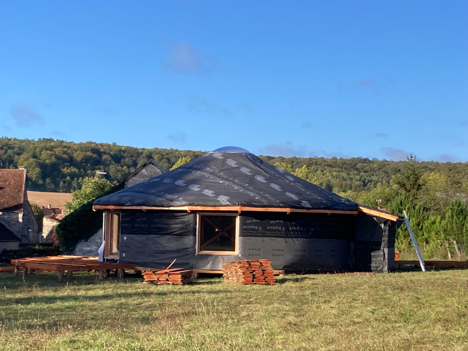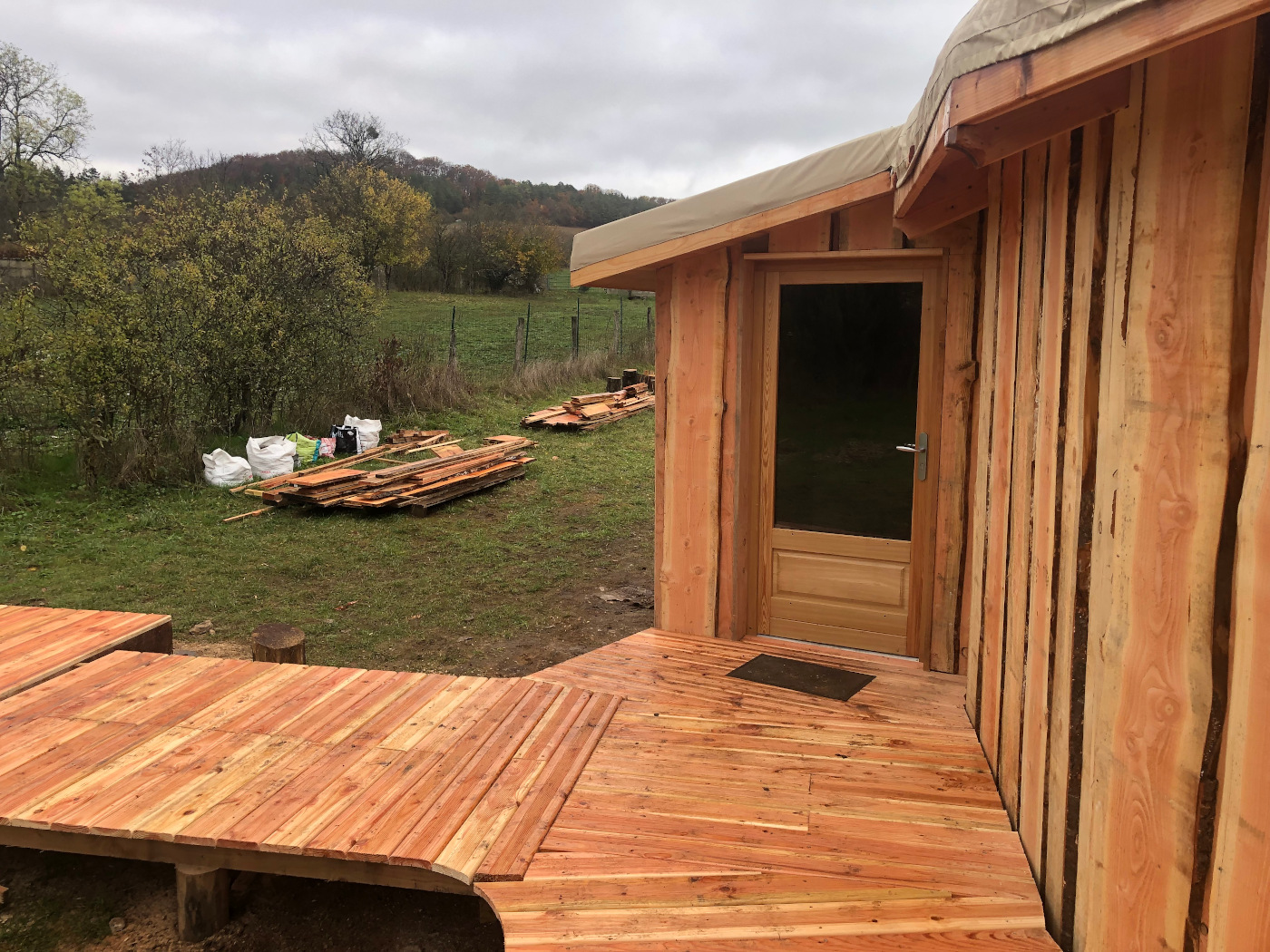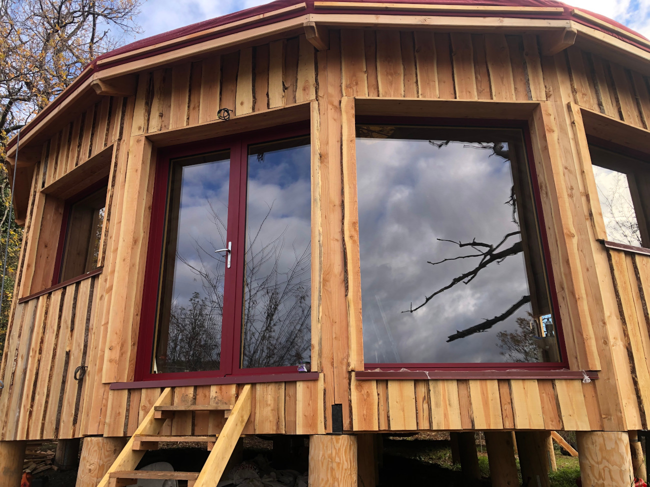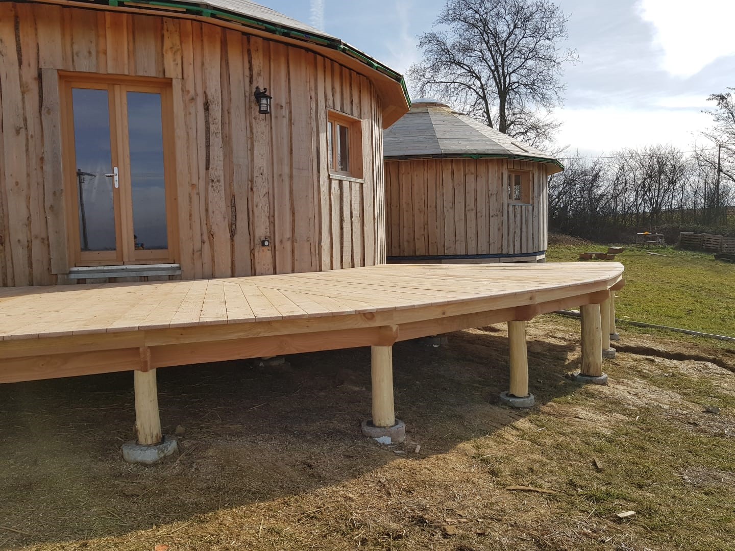 Grande yourte murs ossature bois, offrant une solidité et durabilité accrues. 10 m de diamètre. Plateforme et bardage en autoconstruction par le client. Très grande baie vitrée de 2,10 x 1,60 m. Hauteur de murs 3m. Installée à côté d’une autre yourte autoconstruite par le client.
