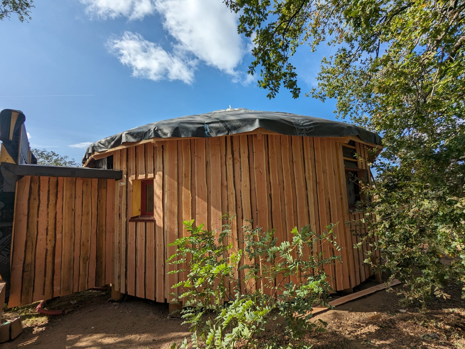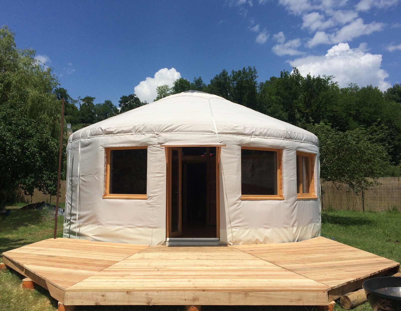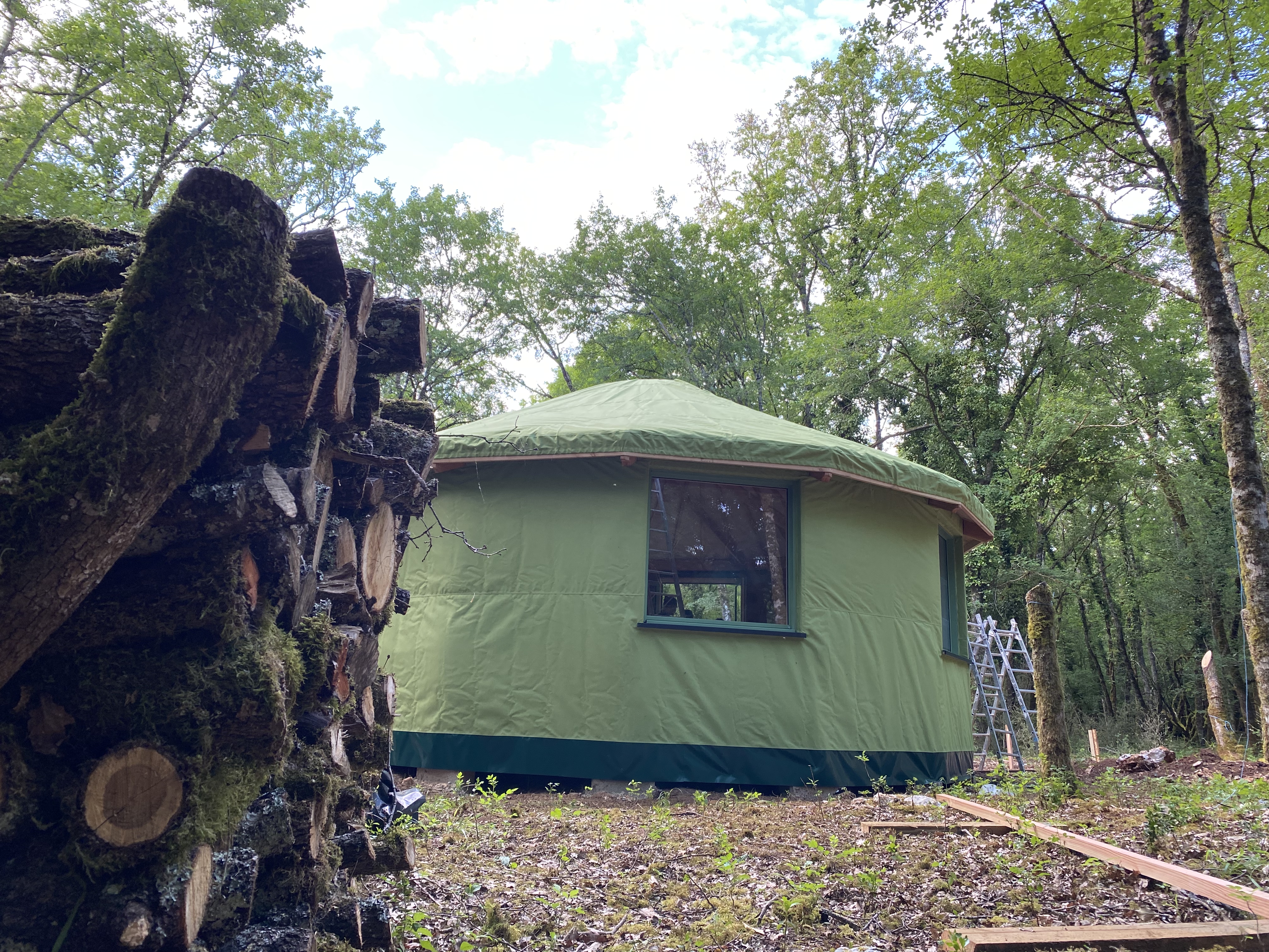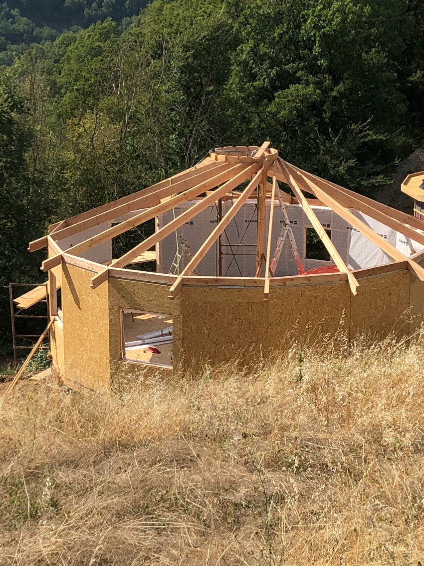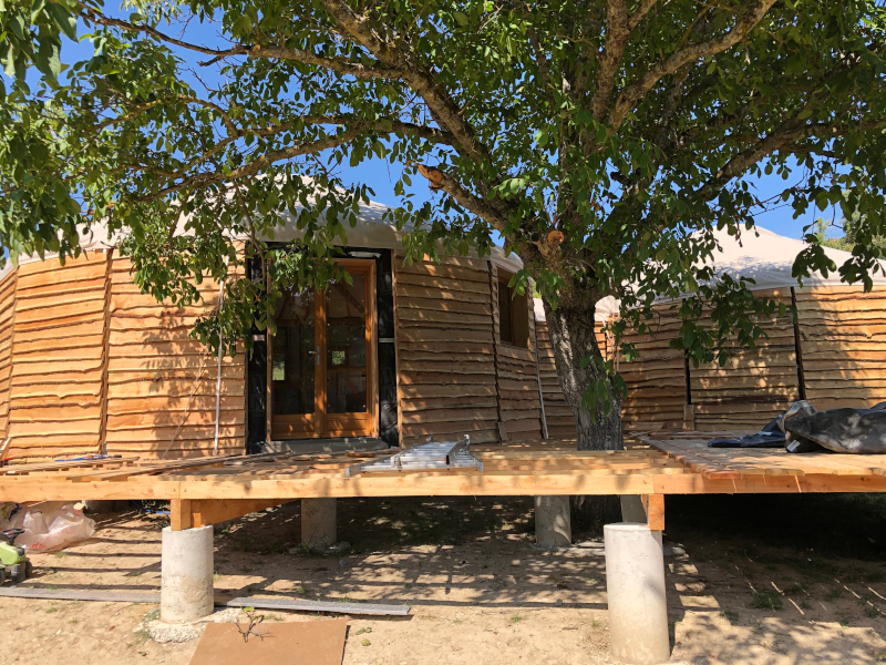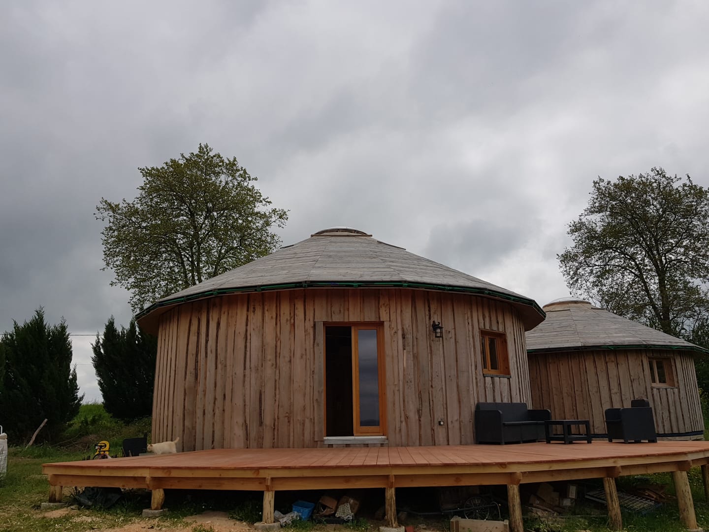Grande yourte murs ossature bois, offrant une solidité et durabilité accrues. 10 m de diamètre. Plateforme et bardage en autoconstruction par le client. Très grande baie vitrée de 2,10 x 1,60 m. Hauteur de murs 3m. Installée à côté d’une autre yourte autoconstruite par le client.