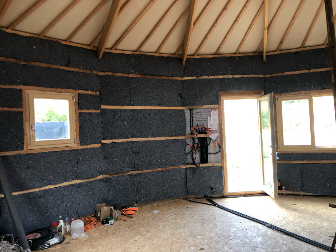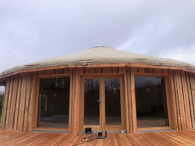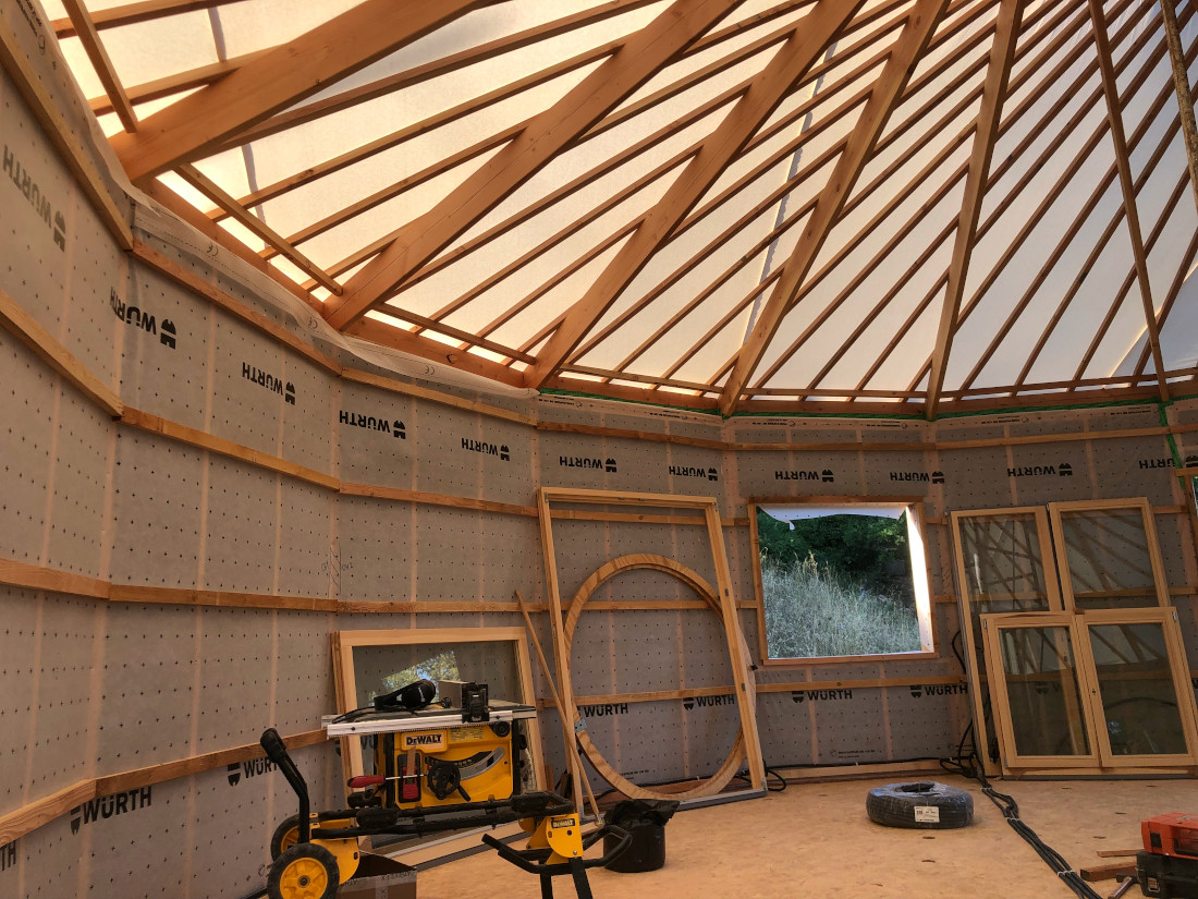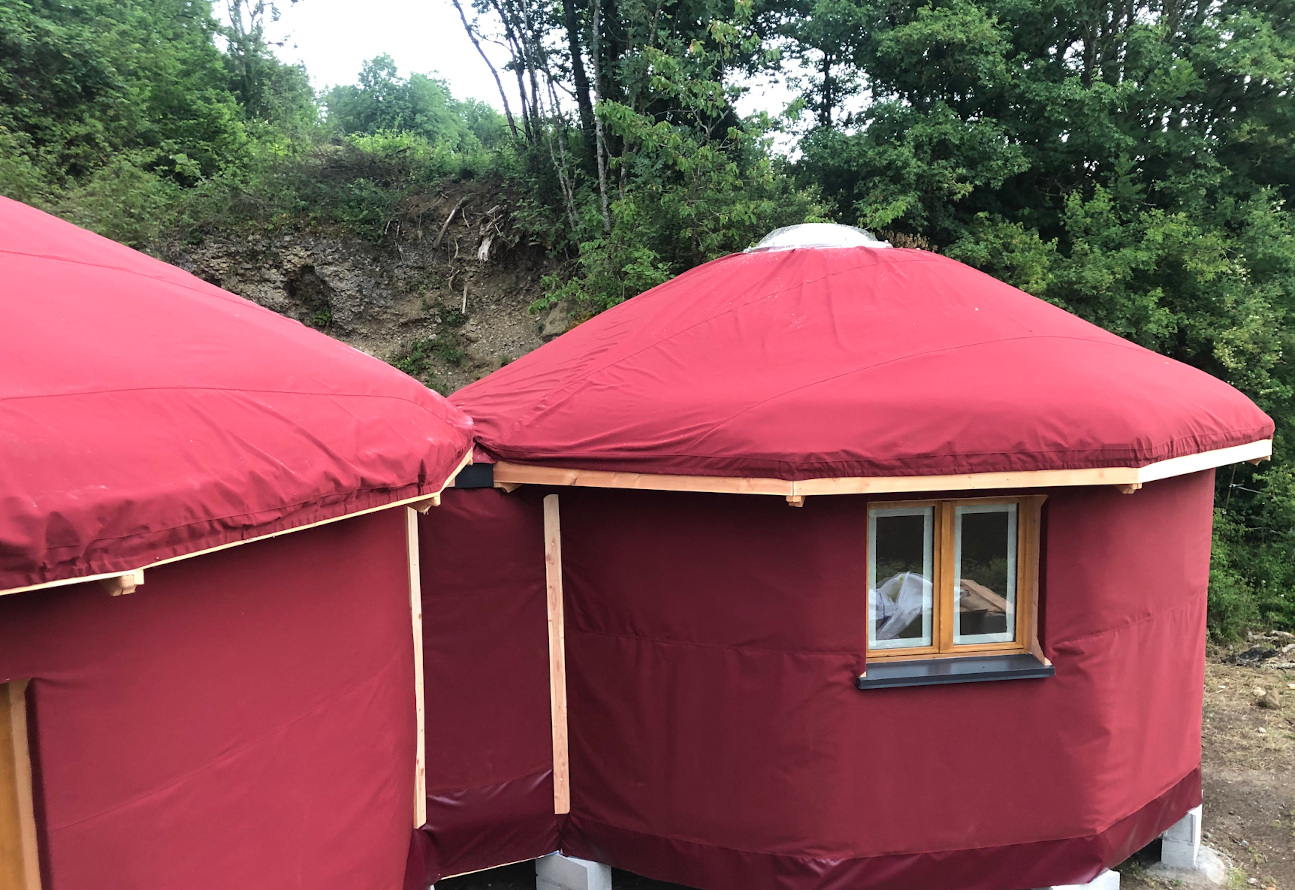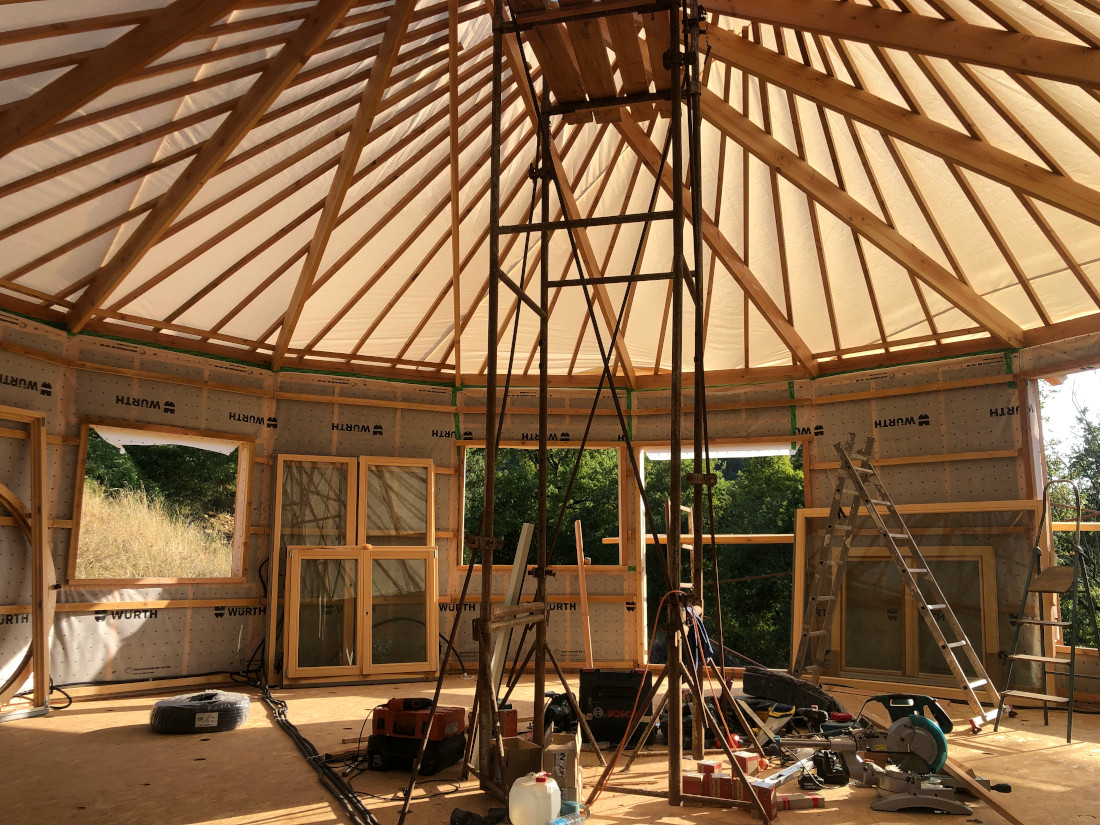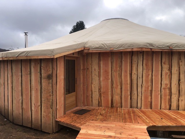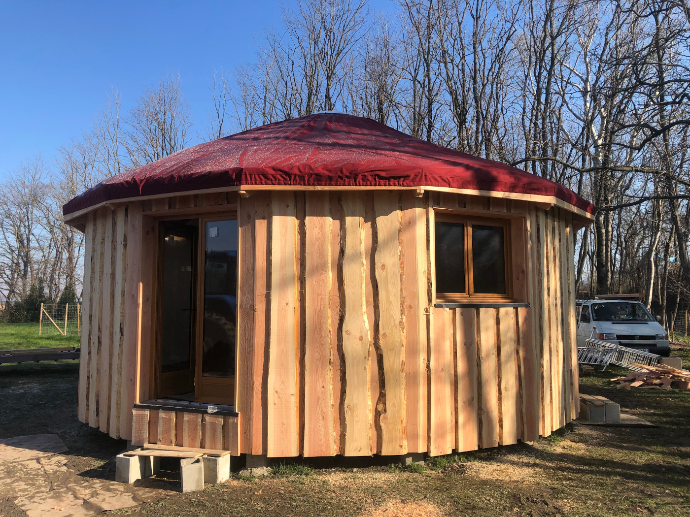Grande yourte murs ossature bois, offrant une solidité et durabilité accrues. 10 m de diamètre. Plateforme et bardage en autoconstruction par le client. Très grande baie vitrée de 2,10 x 1,60 m. Hauteur de murs 3m. Installée à côté d’une autre yourte autoconstruite par le client.
