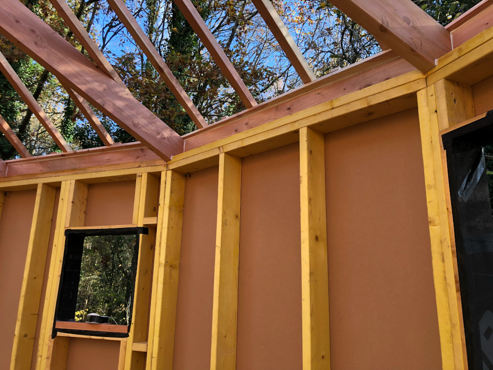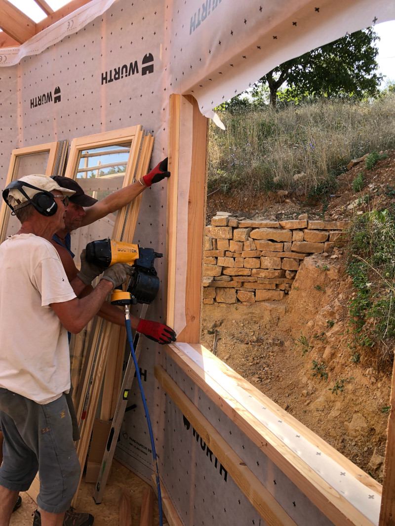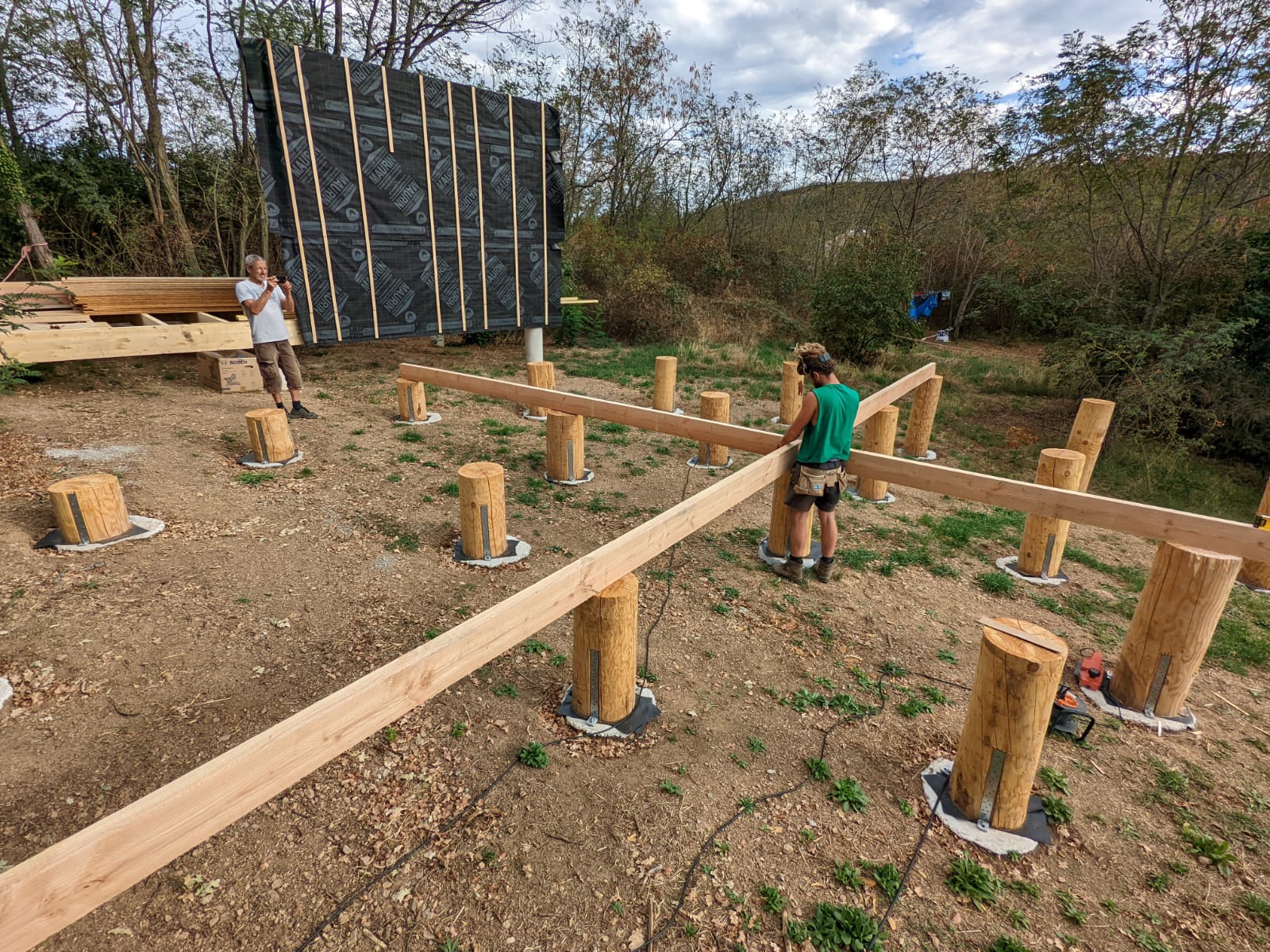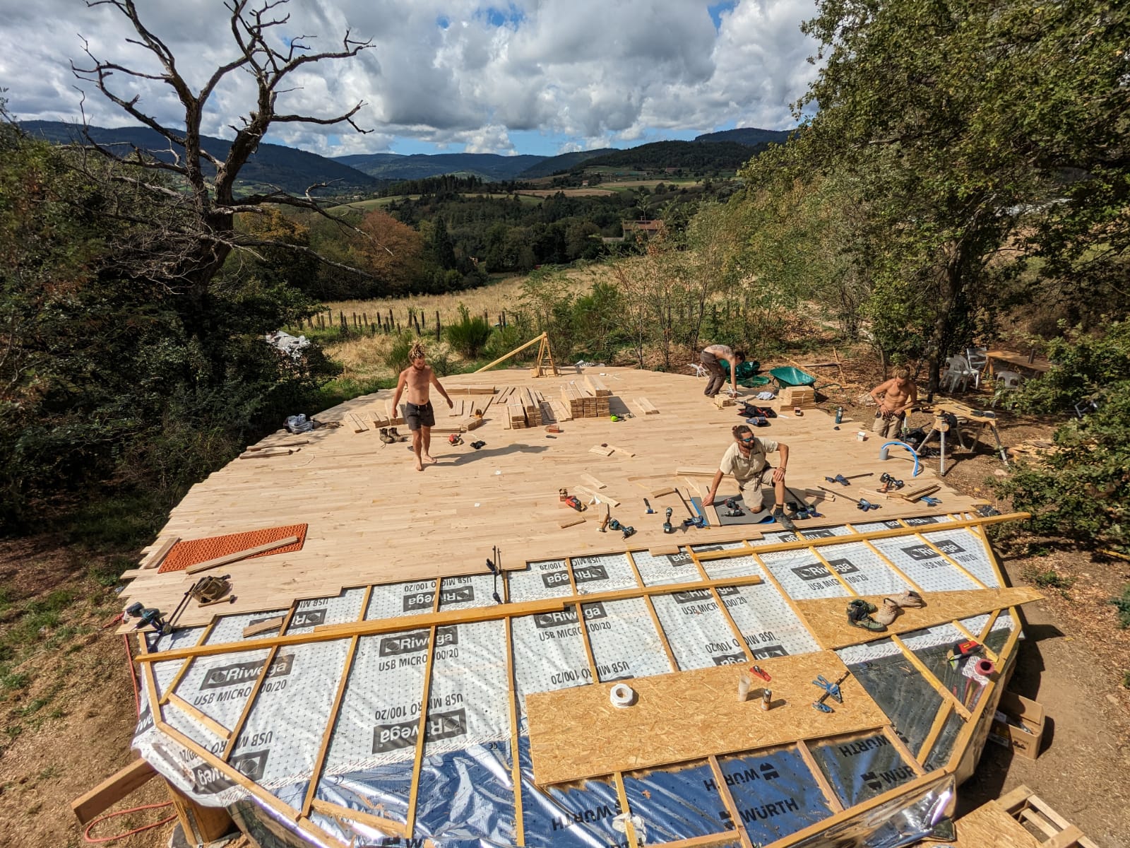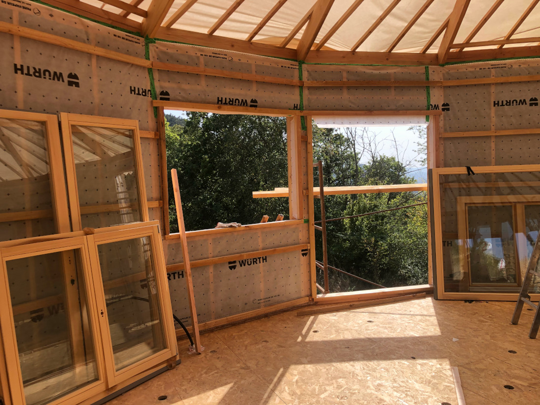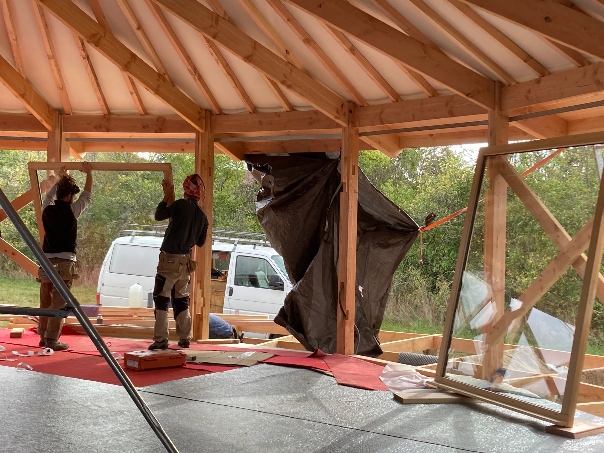 Grande yourte murs ossature bois, offrant une solidité et durabilité accrues. 10 m de diamètre. Plateforme et bardage en autoconstruction par le client. Très grande baie vitrée de 2,10 x 1,60 m. Hauteur de murs 3m. Installée à côté d’une autre yourte autoconstruite par le client.
