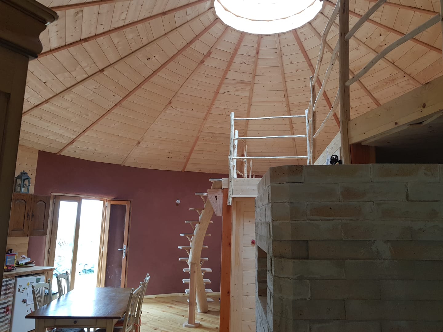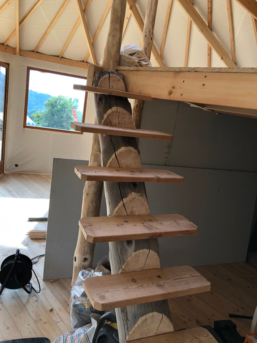 Yourte d’habitation de 7,5 m de diamètre sur pilotis. Murs à 2m50 avec mezzanine. Salle de bain sous mezzanine. Escalier en rondin. Village de montagne à plus de 1000 m d’altitude. (Modèle sans débord de toit).