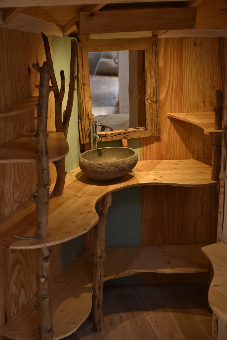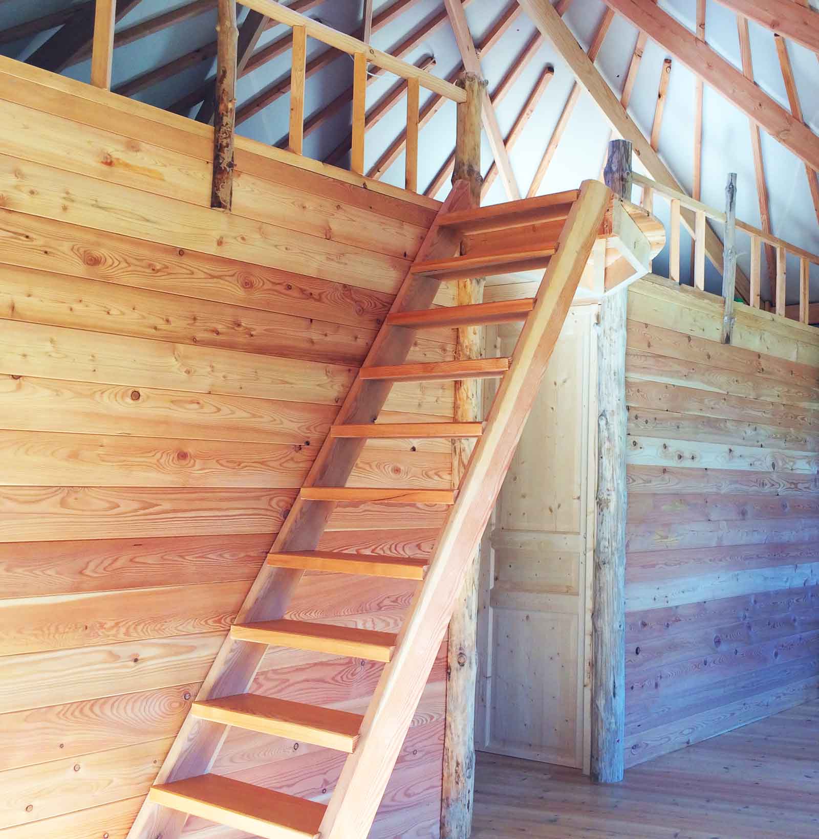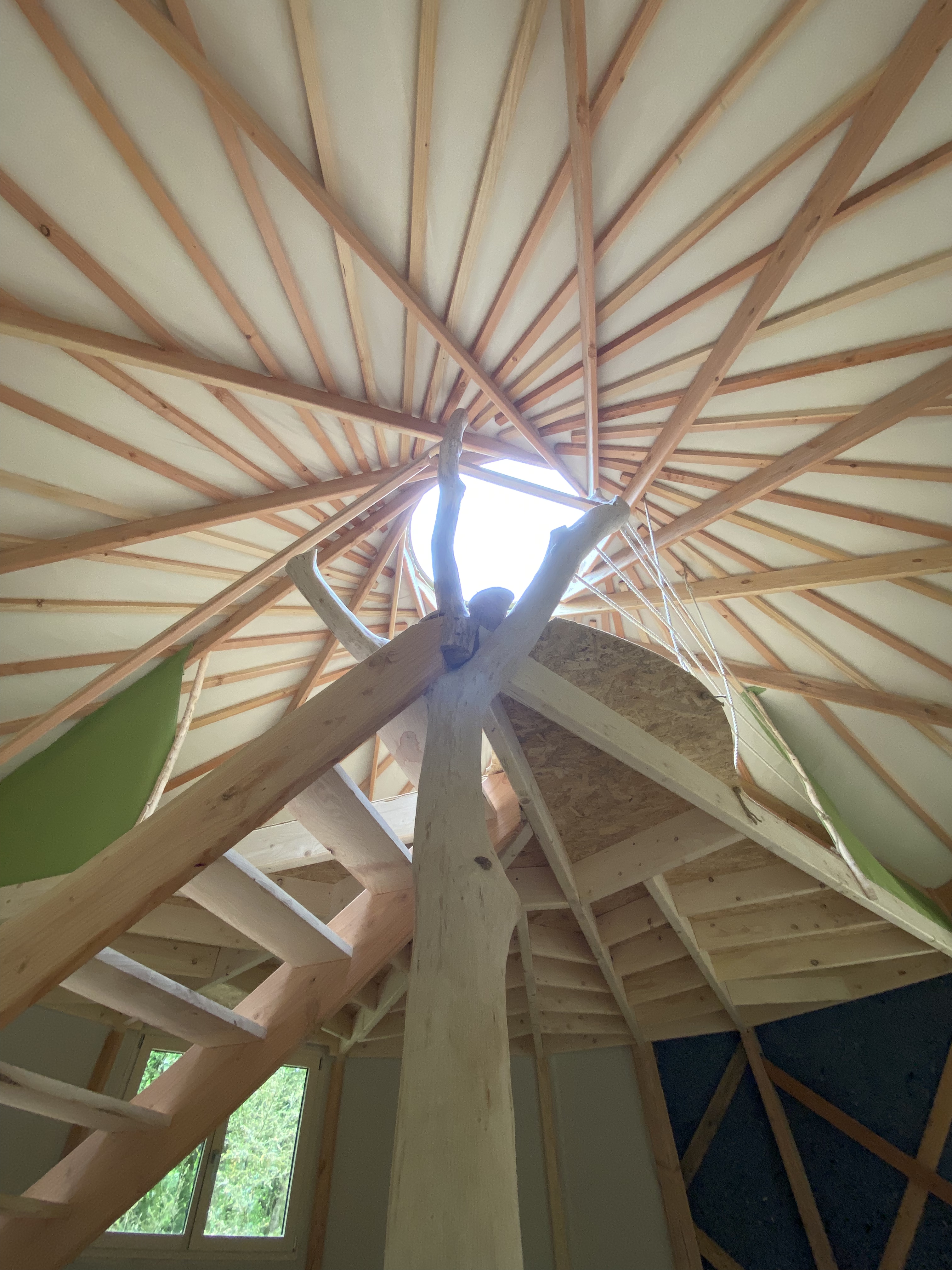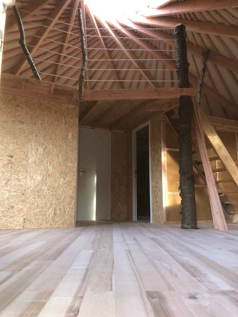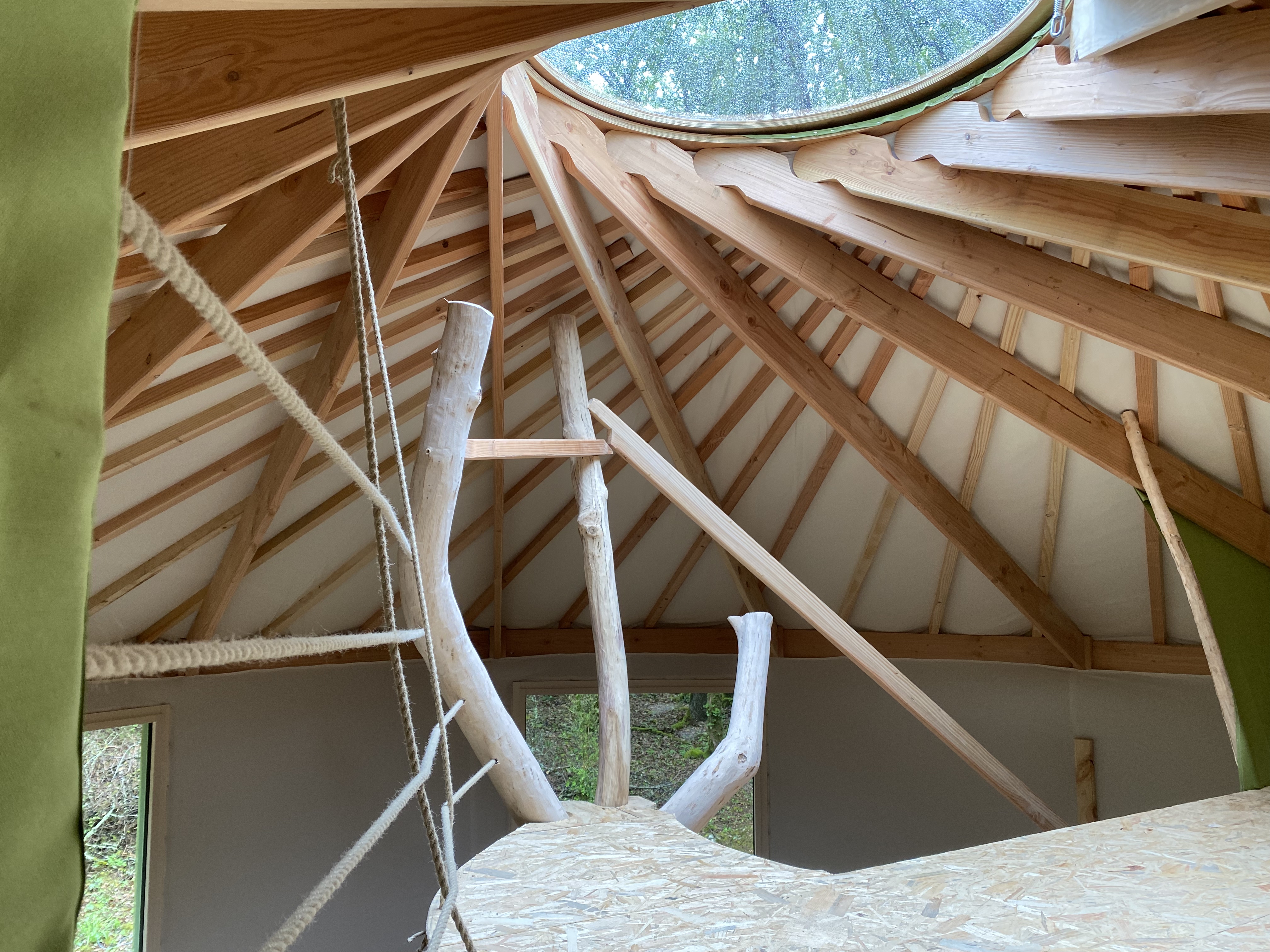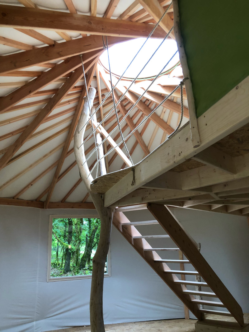Yourtes de 40 m² réalisées pour l’installation d’un jeune couple d’agriculteurs reprenant une exploitation familiale. Accompagner les installations agricoles, grâce aux yourtes, est un sujet qui nous tient à cœur. Ici, le chêne servant de poteau à la mezzanine et aux gardes-corps de l’escalier, provenait du terrain et a été travaillé sur place.