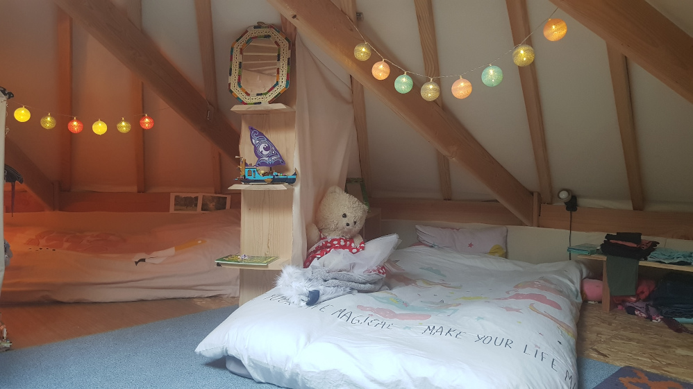 Yourte d’habitation située dans un centre agroécologique. Reliée à une petite maison ossature bois par un sas. 9 m de diamètre. 16 pans. Murs de 1,80 de large par 3 m de haut permettant une belle mezzanine. Plancher en châtaignier. Grandes baies vitrées 210 x 170 pour maximiser la lumière et la vue panoramique.
